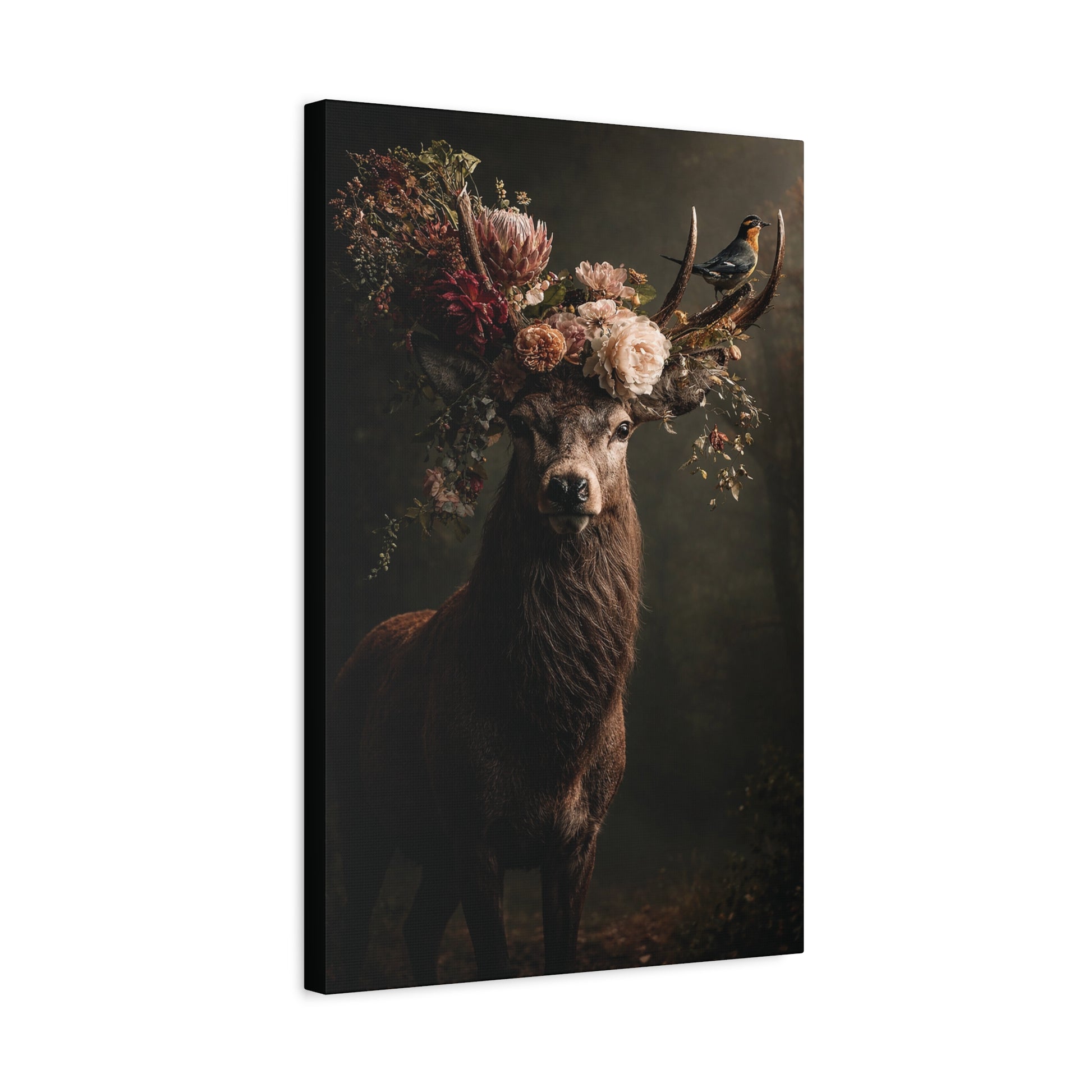 A matte stretched canvas that brings a quiet, poetic presence to any room. This gallery-style print shows a regal stag crowned with a lush bouquet and a small songbird perched on its antler — rendered in deep, painterly tones with exceptional clarity. The muted, earthy palette and soft grain of the matte finish create a timeless, museum-like atmosphere. Lightweight yet sturdy, the canvas arrives ready to hang with back-hanging hardware and soft rubber dots on the lower back to keep it steady against the wall. Each piece is printed with UL-certified Greenguard Gold latex inks on a cotton-poly canvas and stretched over sustainably sourced radiata pine — a thoughtful choice for lovers of nature, art, and quietly dramatic interiors.